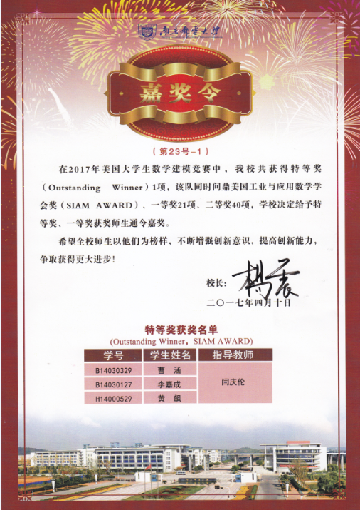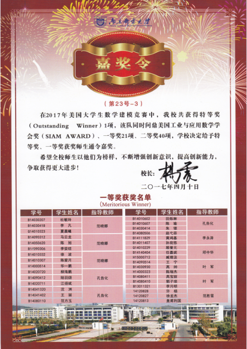 杨震校长签发嘉奖令表彰我校“2017年美国大学生数学建模竞赛”获奖师生
