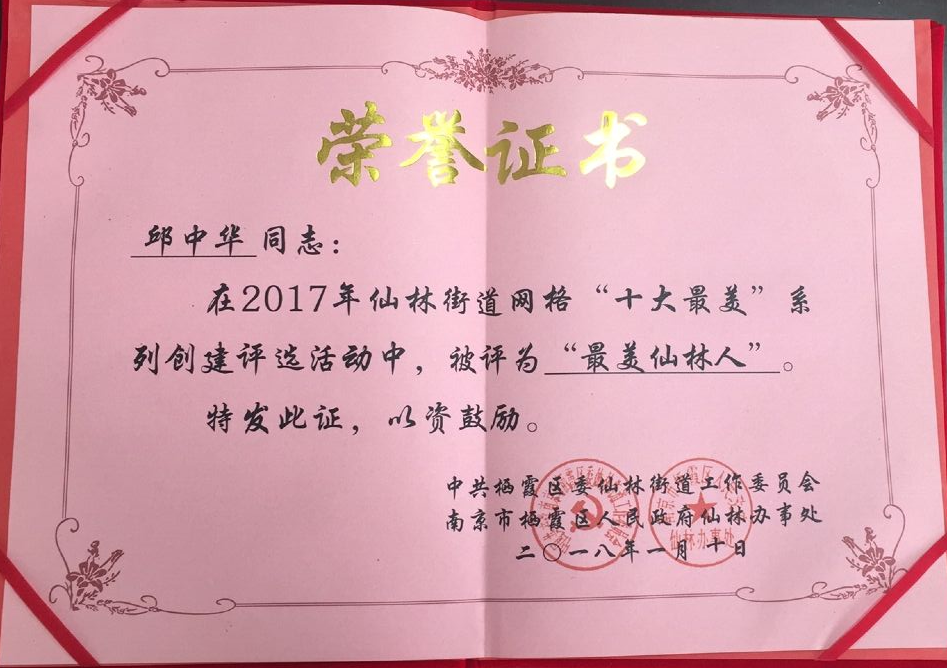 在2017年仙林街道网格“十大最美”系列创建评选活动中,永利官网邱中华老师被评为“最美仙林人”,特此祝贺!