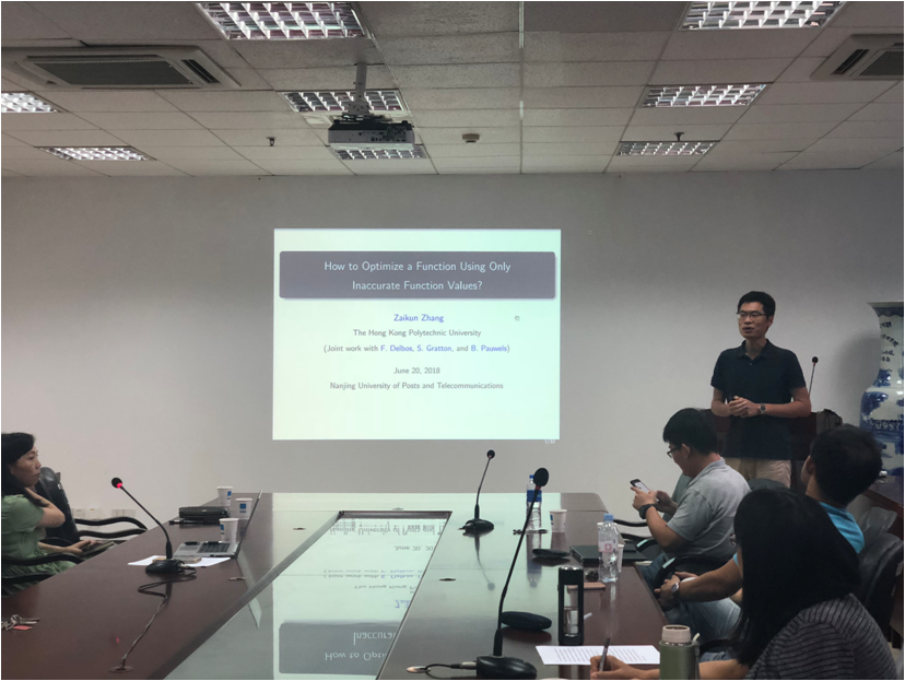 张在坤博士本次报告题目为“How to optimize function using only inaccurate function values?”。在现实世界的优化问题中,通常我们无法取得目标函数的导数信息。这些问题可以通过仅需要函数值的算法来解决,也称为无导数优化算法。本次演讲重点介绍了直接搜索法(最简单的无衍生优化算法之一),并研究了使用不准确的函数值进行直接搜索的行为。