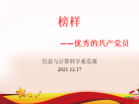 2021年12月17日下午,信息与计算科学系全体老师在教2-326(1)室集中开展党课学习活动。本次活动由支部书记戴建新老师召集,支部党员翟其清老师轮值主持,院党委委员、副院长金正猛教授以普通党员身份参加了党课学习。